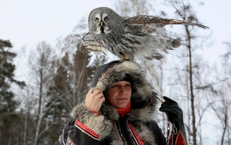 Eine Eule sitzt im Kopf ihres Trainers, Daria Koshcheyeva, während einer Demonstration im Krasnojarsk-Wald in Russland.